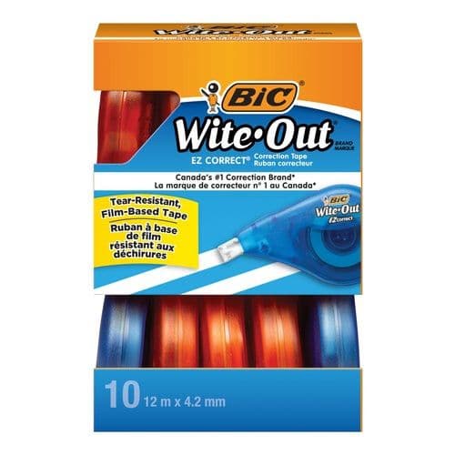Correct mistakes quickly and easily with BIC Wite-Out EZ Correct Correction Tape. This 10-count pack is perfect for home, school, or office use. The white tape applies dry and creates a clean, smooth surface for writing over. Its compact design and easy-to-use dispenser make it an essential tool for any writing task.