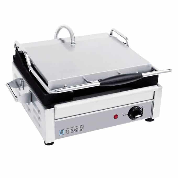 The Eurodib Single-Grooved Panini Grill is the perfect addition to any restaurant kitchen. Constructed from stainless steel and cast iron, this grill is both durable and easy to maintain. It features an adjustable thermostat up to 300°C (570°F), 15 Amps, 120 Volts, and 1800 Watts, for fast and consistent cooking. With a NEMA 5-20P plug, the grill is easy to install. The dimensions of the grill are 43.2 cm x 26.1 cm x 23.5 cm (17 in. x 10.25 in. x 9.25 in.) and it weighs 15.9 kg (35 lb). With model SFE02325, you can enjoy delicious grills in no time!