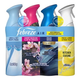 Febreze Air is an air freshener that comes in Linen/Gain/Lemon/Ocean scents, bringing freshness to any room in the home. It eliminates odors and leaves a pleasant scent in the air.