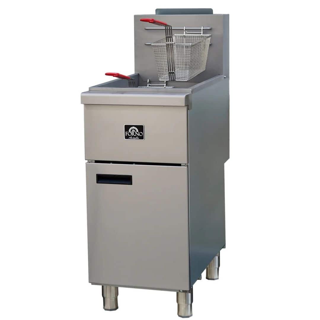 Introducing the Forno 15.5 in. 50 lb Stainless Steel Natural Gas Commercial Deep Fryer with Twin Baskets. This deep fryer is perfect for any commercial kitchen or food truck, with no electrical connection required. Its durable stainless steel exterior and fry tank ensure longevity and ease of maintenance, while the 4 burners of 30,000 BTU/h (total of 120,000 BTU/h) provide efficient heating. With a 40 to 50 lb capacity stainless steel oil tank and temperature control range of 200°F to 400°F, this fryer can handle all your frying needs. The full port drain valve and 2 heat-resistant baskets make cleaning and frying a breeze. Plus, its compact vertical design makes it ideal for small kitchens and food trucks. Order yours today and experience the convenience and efficiency of the Forno commercial deep fryer.
