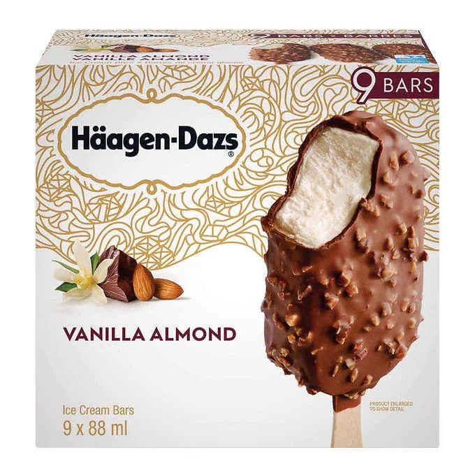 Häagen-Dazs Vanilla Almond Ice Cream Bars are the perfect indulgence for ice cream lovers. Enjoy the rich, creamy flavour of vanilla almond ice cream in a convenient bar form. Each box contains 9 × 88mL bars, perfect for sharing or enjoying alone. Keep these bars frozen for a delicious, decadent treat.
