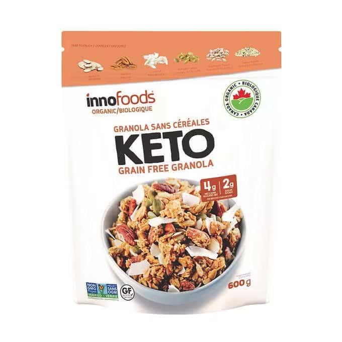 Inno Foods Organic Keto Grain Free Granola is Keto diet friendly, with 4 g of net carbs per serving and 2 g of sugar per serving. It is organic, gluten free, kosher certified, non GMO and contains no artificial flavours or colours. The container size is 600g.