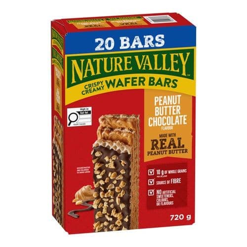 Indulge in the delicious and crispy Nature Valley Wafer Bar. Made with real peanut butter and whole grain oats, this snack is perfect for satisfying your cravings. Each box contains 20 individually wrapped bars, each weighing 36 g. Perfect for on-the-go snacking or for packing in your lunch.