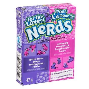 Indulge in Wonka's Nerds Grape and Strawberry Candy! These tiny, tangy, crunchy candies are the perfect treat for your sweet tooth cravings. Enjoy the delectable combination of grape and strawberry flavour with no artificial flavours added! Each pack contains 24 × 46.7 g (1.64 oz) of Nerds candy. Get your hands on this delicious candy now!