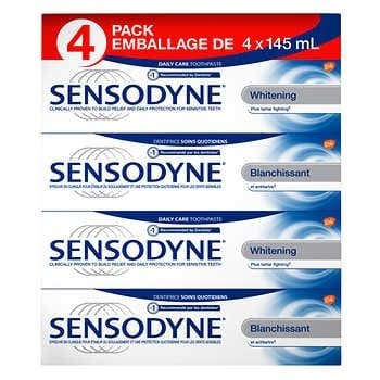 Introducing Sensodyne Whitening Toothpaste, the perfect daily care toothpaste for those with sensitive teeth. Its unique formula not only helps to whiten your teeth, but also fights tartar buildup. This package includes 4 tubes of 145 mL each.