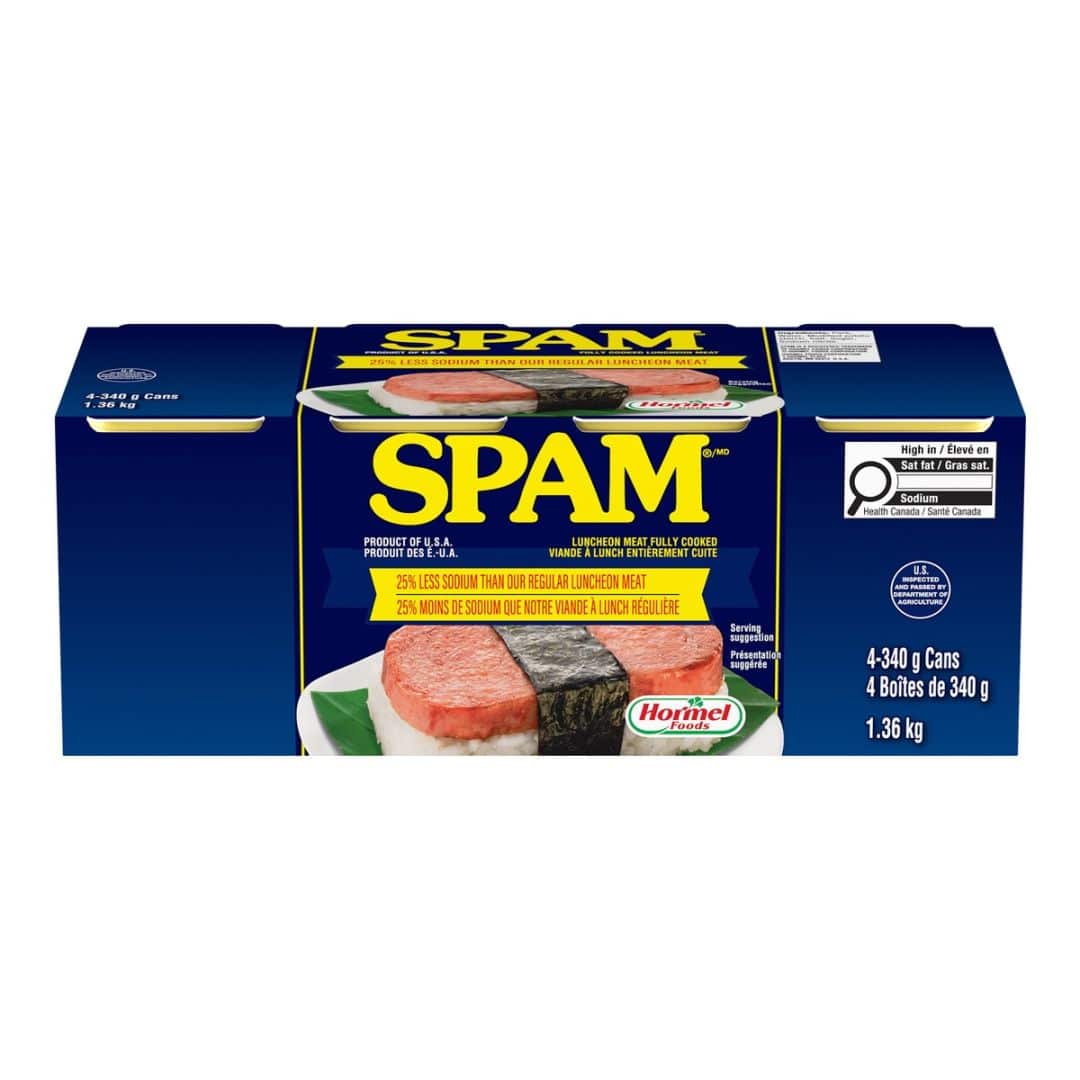 Try our delicious SPAM Luncheon Meat with 25% Less Sodium. Made from premium quality pork, our luncheon meat is perfect for sandwiches, salads, or as a quick snack. Each pack contains 4 cans, each weighing 340g.