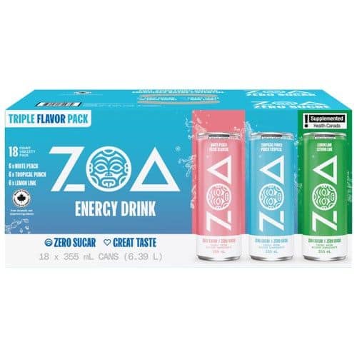 Get ready to be energized with ZOA Energy Drink Triple Flavour Variety! This pack includes 18 cans of 355 mL each, with three delicious flavors to choose from: Original, Mango and Lemon-Lime. ZOA Energy Drink is the perfect choice for anyone looking for a boost of energy without the crash. Made with natural ingredients and vitamins, ZOA will keep you energized and focused throughout the day. Grab a pack now and experience the power of ZOA Energy Drink!